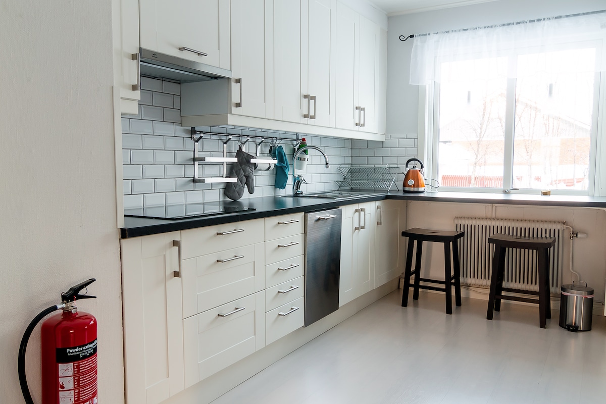 Bienvenido a tu hogar lejos de casa y a este acogedor y divertido departamento de 70 m2 en el segundo piso de nuestra casa. Disfruta de 2 cómodos dormitorios (capacidad para 6 personas en total: 4 x individuales, 1 x dobles), una cocina/sala de estar abierta y una moderna ducha. El departamento también tiene un gran balcón, ¡ideal para contemplar las luces del norte o relajarse en verano! Se incluyen ropa de cama, toallas y estacionamiento gratuito. Perfecto para parejas, familias y grupos que buscan una ubicación cómoda y privilegiada para sus aventuras árticas.