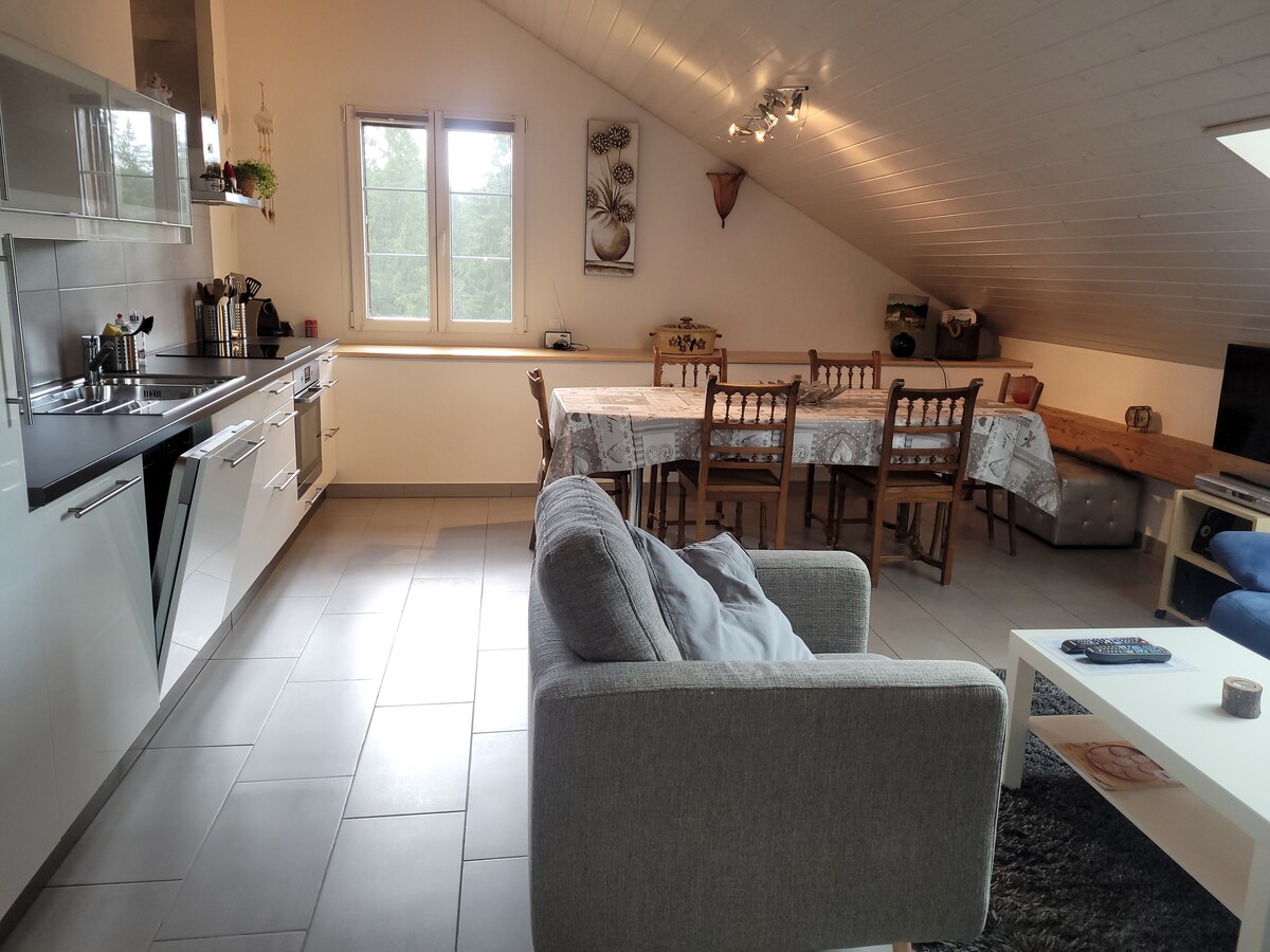 Loft de alta calidad, en un establo de 300 años, hemos ampliado el pajar Inodoro y ducha separados. Justo en la pista de esquí, senderismo y rutas en bicicleta. Ubicación muy tranquila, solo escucharás el canto de los pájaros y el buen chapoteo. Muy buen acceso en auto.