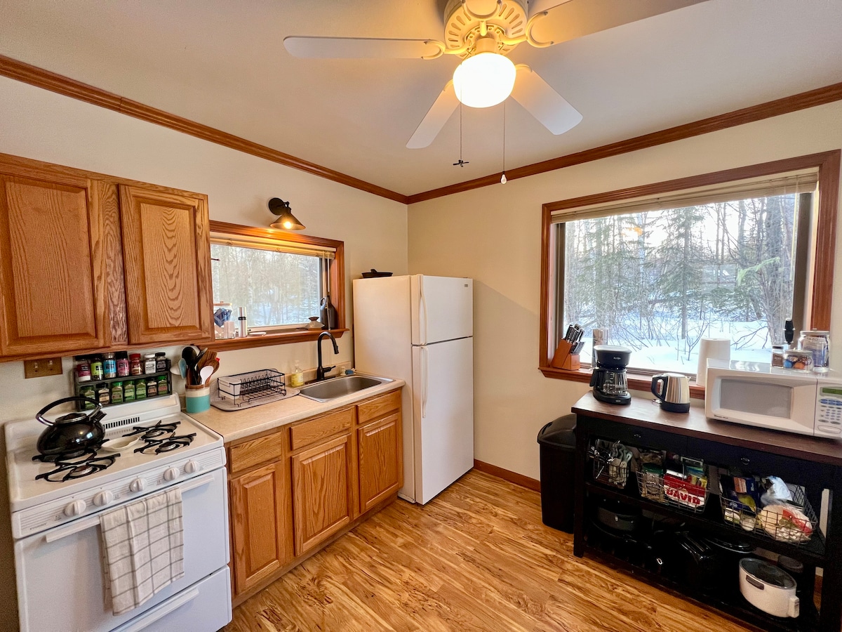 Amplio estudio en un barrio tranquilo de Alaska. Baño completo con bañera/ducha de azulejos de metro para sumergirse después de un largo día de pesca. Una cocina espaciosa con estufa/horno de gas, microondas, tostadora, lavabo, nevera, mesa, sillas y una barra rústica con taburetes para pasar el rato. En el extremo más alejado de la habitación hay una cama tamaño queen y un armario. El salón está amueblado con un gran sofá cómodo con capacidad para otra persona. * A2,5 horas del parque Denali Natl *