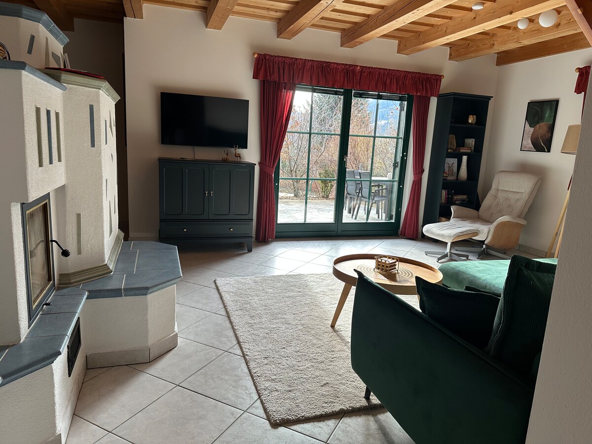 Departamento renovado de alta calidad de 120 metros cuadrados con cocina moderna de ensueño, sala de estar rústica con sofá gigante y sistema de cine en casa (Sky, Netflix, etc.), acogedora estufa de azulejos, baño grande (ducha de vapor, bañera, tocador doble, lavadora secadora, barras de secado) y un gran guardarropa. 3 habitaciones dobles (2 personas cada una) Opcional: 1 sofá cama en la sala de estar (2 personas) Además, ¡bodega de esquí asociada, amplia zona al aire libre con jardines y animales de granja y plazas de aparcamiento asociadas!