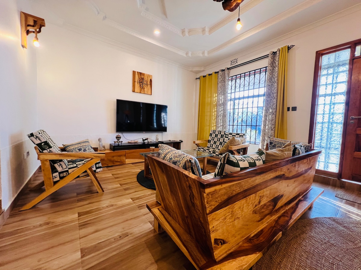Villa de 2 dormitorios con cocina totalmente equipada y baño espacioso. Esta villa tiene capacidad para 4 personas. Una impresionante piscina de agua dulce está justo enfrente de la sala de estar y la playa prístina está a solo unos pasos. La propiedad está rodeada de hierba de limón perfumada (Mchaichai) y muchas otras plantas en una residencia privada segura. Todas las habitaciones tienen aire acondicionado y están bien ventiladas. Acogedor salón al aire libre, comedor/barbacoa que hacen que la vida al aire libre sea perfecta. También hay tumbonas disponibles en nuestra playa privada.