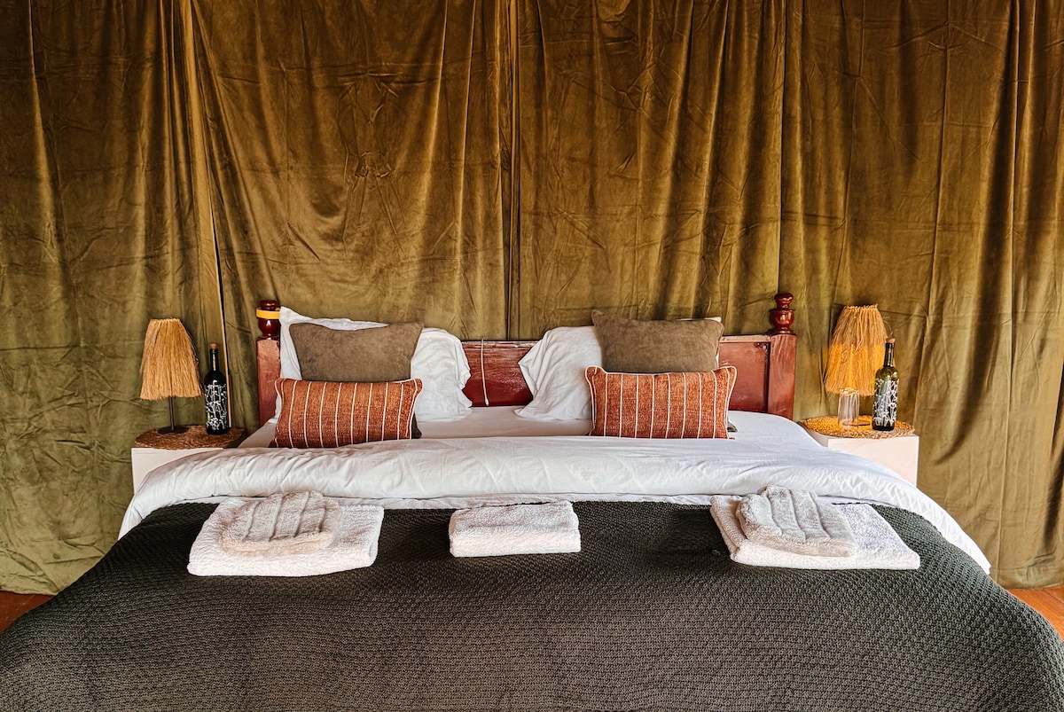 Unwind in a stylish safari-style tent nestled in lush greenery. Enjoy a comfy bed, zebra-print accents, and a private outdoor sitting area. Surrounded by trees and birdsong, it's the perfect peaceful escape. Sleep under canvas with the comfort of a real bed — ideal for couples, solo travelers, or nature lovers. Breakfast, restaurant, campfire on the property! Two identical tents available — message us if you’d like to book both. Breakfast included.