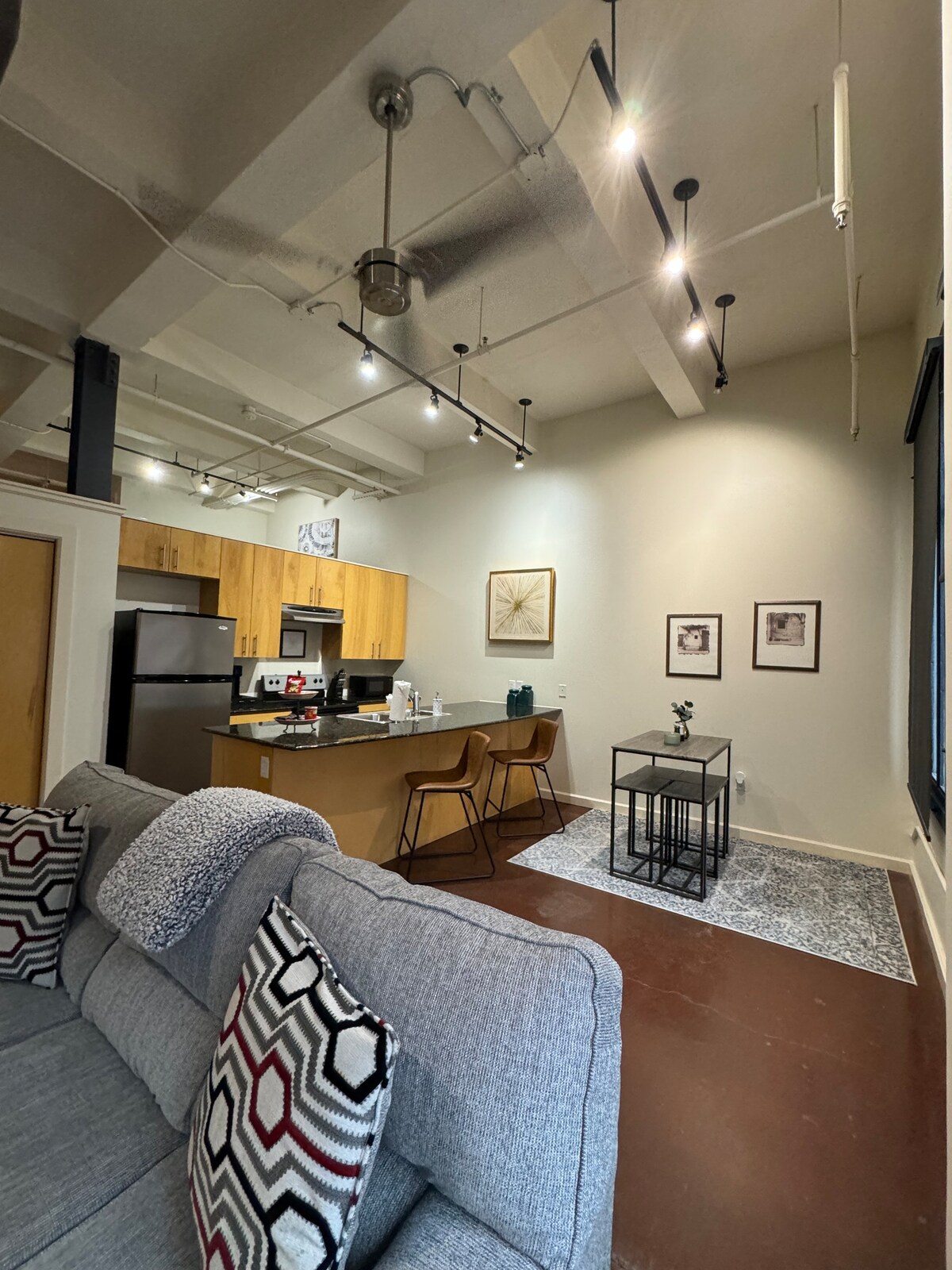 1 dormitorio, cama tamaño king + litera, 4 huéspedes Espacio y estilo a partes iguales. Este loft Kress tiene capacidad para 4 personas, con una cama tamaño king en la planta superior y una litera en la planta principal, y se caracteriza por sus altos techos de 6 metros (20 pies), una cocina gourmet con barra para desayunar y un sofá en forma de L ideal para relajarse. A una cuadra de Sundance Square. A tres del Centro de Convenciones. Arte de origen local en cada pared. La mejor manzana del centro de Fort Worth, con un estilo de vida auténtico.