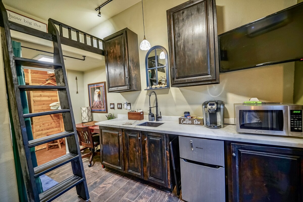La pequeña casa «Eagle Nest» se encuentra en un gran terreno con enormes árboles y mucha privacidad. A solo 10 minutos del distrito de entretenimiento de Arlington. Dallas Cowboys, Texas Rangers, Sixflags, parque acuático y Texas Live. El centro de Fort Worth está a poca distancia en coche. Eagle Nest tiene ducha, inodoro, microondas, cafetera, wifi y TV inteligente con cable. El loft tiene una cama doble, el sofá también se convierte en una cama completa. La zona exterior es muy acogedora, con un patio privado, chimenea y parrilla de carbón.