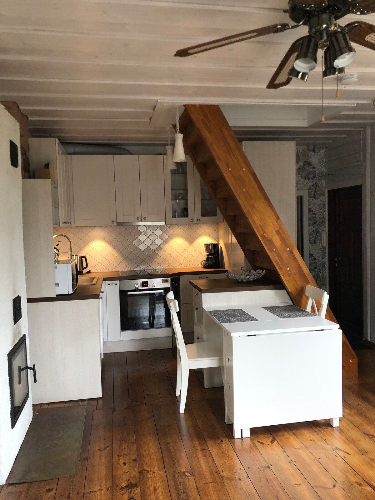 Cabaña pequeña de 2 pisos de planta abierta. Arriba: capacidad para 4 personas (2 colchones) Sofá plegable de 2 pulgadas. Refrigerador, placa de inducción de 2 plazas, horno de cocina, lavavajillas, chimenea, estufa de leña, bomba de calor de fuente de aire. También la casa es cálida en invierno. Duchay calefacción por suelo radiante en el baño. Terraza. Sauna de barril: € 70 extra. Parrilla: trae carbón, otros proporcionados. Parque infantil, cama elástica, columpios, tirolina, casa de juegos, patio para correr. Tenemos un perro pequeño, un mini conejo, pollos. En la casa de al lado viven personas de la familia.