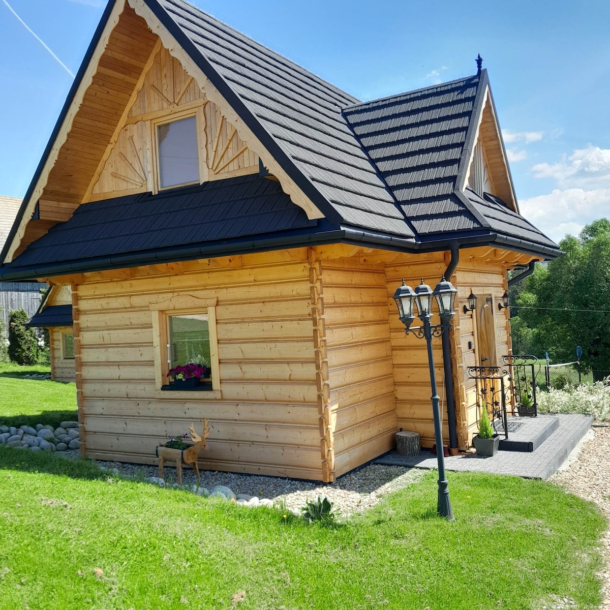 Przytulny domek bliźniak z bali tuż przy lesie – z balią, sauną i stołem bilardowym. Idealny na rodzinny wypoczynek lub wyjazd z przyjaciółmi. Cisza, natura, a jednocześnie tylko kilkanaście minut od Zakopanego i Term. Chatka góralska to domek bliźniak który składa się z dwóch niezależnych domków, obecnie jest wynajmowany jeden. Apartament jest na 8 osób, ma 2 sypialnie i 2 łazienki , oraz salon, a pod domkiem jest sala bilardowa.