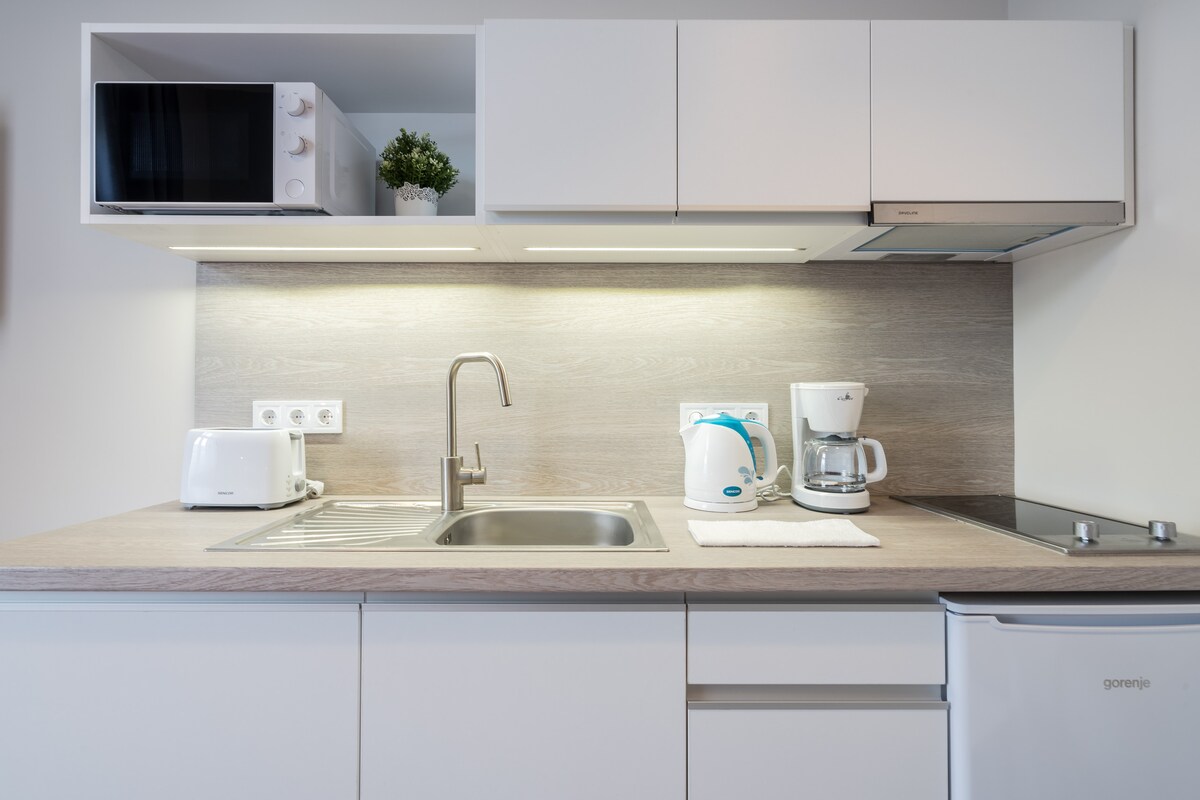 Nuestro apartamento estándar también está excepcionalmente equipado y ofrece un descanso tranquilo y relajante para parejas con su diseño único y acogedor. El apartamento para dos personas tiene su propio baño con ducha y una cocina totalmente equipada. En su enorme terraza (20 m2) es posible descansar a la sombra y relajarse en una tumbona.
