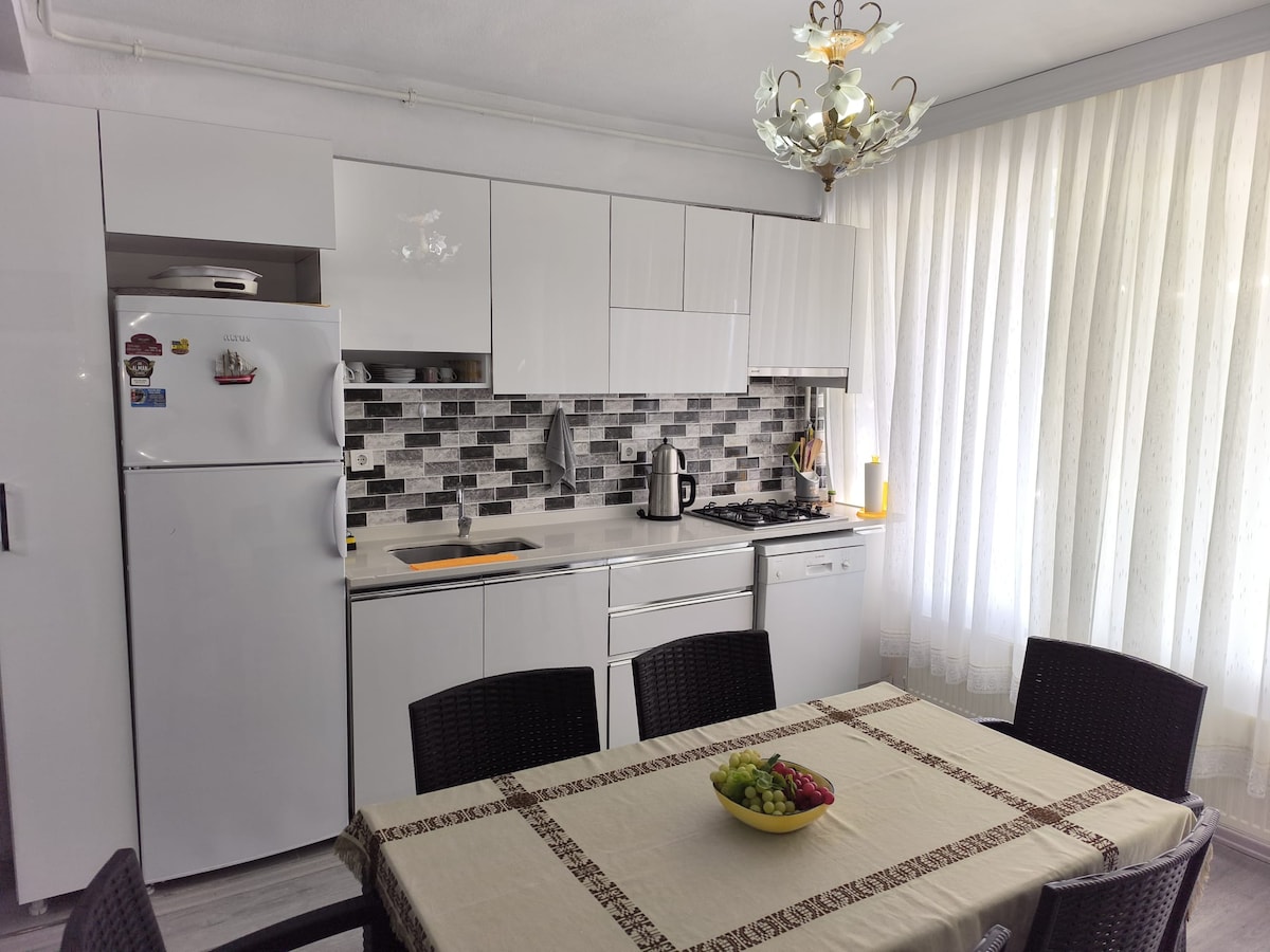 Es un apartamento adecuado para familias y parejas, situado en el centro de Mürefte, a 25 metros del mar. Hay 1 dormitorio doble con baño principal y un segundo dormitorio con sofá cama doble. Hay otro baño con lavadora. La cocina está equipada con nevera, lavavajillas y todos los utensilios de cocina básicos. El balcón, que cuenta con una mesa para cuatro personas, conecta la cocina con el salón. El salón cuenta con un grupo de asientos para 2 personas y otro para 3 personas, así como una mesa redonda y un televisor.
