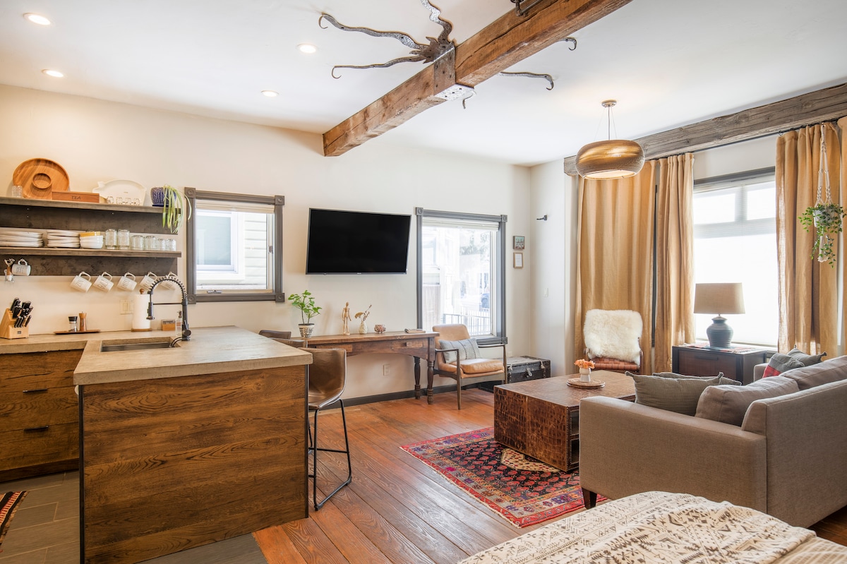 ¡Estudio superestiloso situado en el centro de Telluride! Cerca de tiendas, restaurantes, remontes y la telecabina gratuita. ¡Los techos altos y los suelos de madera antigua lo convierten en un acogedor campamento base! Cocina grande y completa y amplio salón. Ideal para 2 personas, una familia pequeña o una escapada en pareja. No necesitas coche una vez que estás aquí y se proporciona un pase de aparcamiento. Disfruta de una ubicación típica de pueblo de montaña justo frente a tu puerta con vistas a la zona de esquí y el ritmo idílico de la vida alpina a la vista.