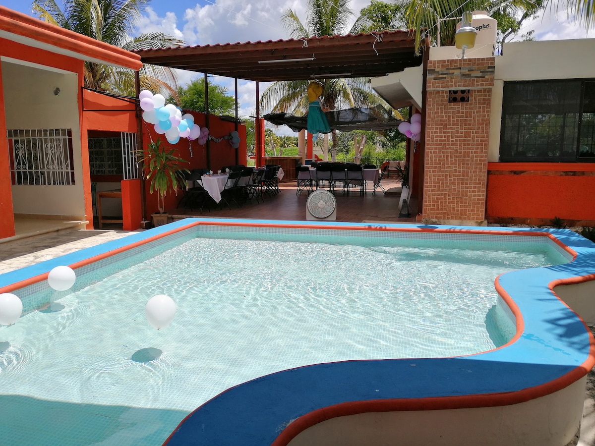 Un espacio para descansar con todas las comodidades: Aire Acondicionado, TV Satelital, Alberca, Agua Fría y Caliente, Asador, Mesa de Pimpón, Wifi. Date el descanso que te mereces a solo 15 minutos del centro de la Ciudad de Campeche en coche. Contamos con una cama individual, una matrimonial, sofá cama matrimonial, espacio para hamacas, colchones inflables.