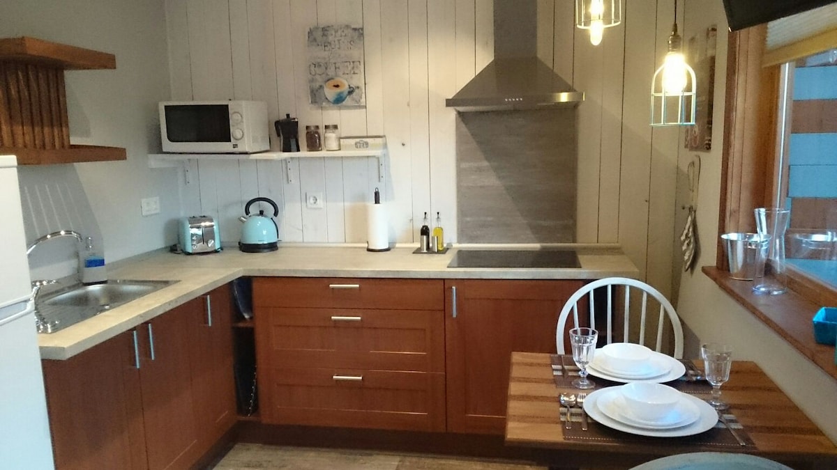 Pequeña casa de piedra y madera, en parcela compartida con la vivienda de los propietarios y otra vivienda vacacional sobre la de los propietarios con entradas independientes. Pequeña piscina no climatizada, barbacoa cubierta con cocina de gas , jardín, chill out y solárium compartidos con los otros 2 huéspedes. Interior: cocina, pequeña mesa y 2 sillas, baño con ducha, salita, SmartTV, wifi , aire acondicionado y dormitorio con cama 160x200. Hay 3 perros(golden retriever)sueltos muy cariñosos.
