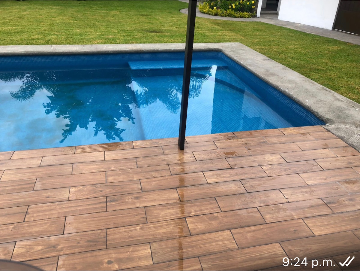 Estilo Cuernavaca, ubicada en colonia de prestigio a 15 minutos del zócalo, cerrada tranquila sin tráfico, muy cerca de la salida a la autopista para México. Alberca totalmente privada, Jacuzzi con espreas para masaje corporal, hamacas, camastros y baño en jardín y asador con carbón gratuito. Jardín amplísimo y privado con dos terrazas e iluminación nocturna en exclusividad. e aceptan niños y/o mascotas bien educadas. Mi esposo y yo vivimos en la casa mas no tendríamos que vernos.