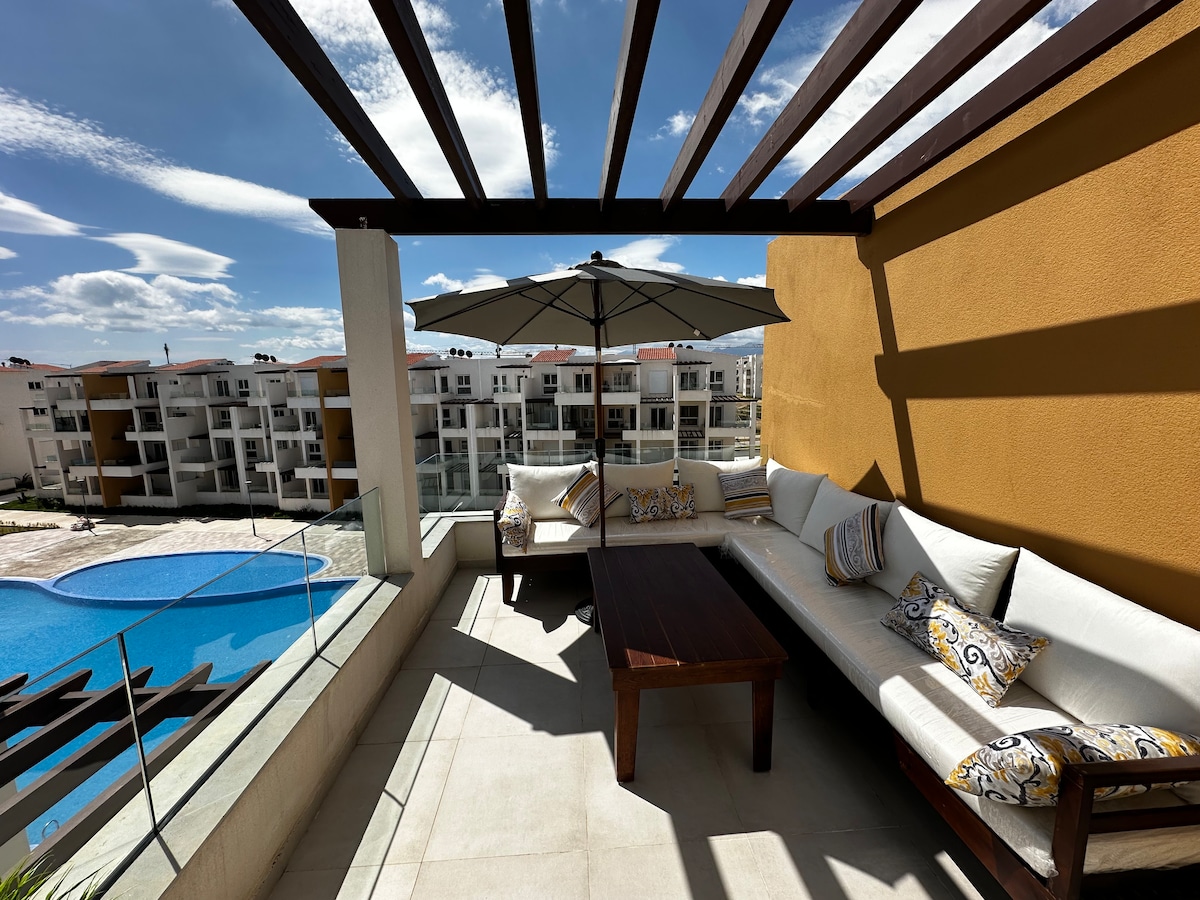 Moderno apartamento en residencia segura con WiFi fibra óptica (60 Mb/s), Netflix, Smart TV, piscinas, jardines y terraza privada. Ideal para vacaciones, trabajo o teletrabajo. A 5 min de la playa y cerca del campo de golf. Totalmente amueblado y decorado con estilo. Solo para parejas casadas (se requiere prueba).