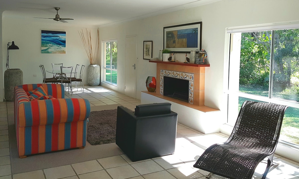Tu propio tramo privado de río salvaje a solo 15 minutos de Hastings St, incluye kayaks. 4 acres de arbustos, parque estatal fronterizo. Terraza en los árboles, pesca y kayak de tipo salvaje (proporcionado) desde el jardín. A los niños les encanta, a los padres también. Siéntate alrededor de una fogata junto al río, cocina bajo las estrellas y escucha el chapoteo de los peces. Tal vez los niños echen un sedal al río (se proporciona equipo de pesca). Noosa está muy cerca. También hay disponible un estudio independiente, luminoso y moderno de 3 habitaciones para dos personas junto al arroyo.