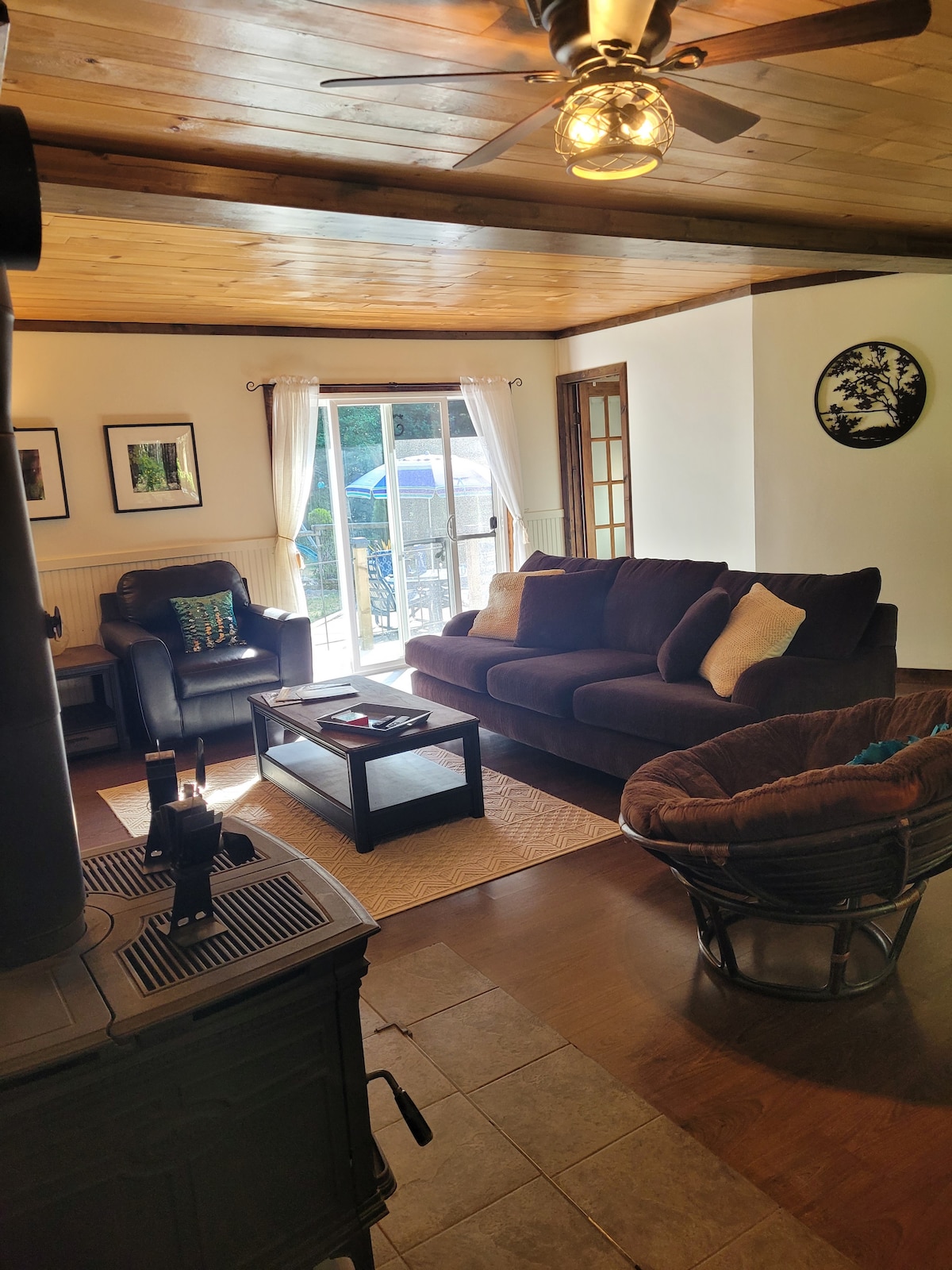 Nuestra cabaña en la azotea tiene una gran sala de televisión independiente en el segundo nivel, donde se encuentra la terraza, que es el segundo dormitorio. Puedes acomodar a los niños mayores en el sofá cama o a otra pareja en el piso de arriba, donde hay un medio baño. Relájese y disfrute de nuestra sauna para 12 personas y baños fríos. Los senderos para caminar están cerca y a poca distancia en coche de las playas públicas. Reserva un Carter para pescar, ya que el puerto deportivo está cerca. Tenemos senderos para ciclismo de montaña, quads y todoterreno.