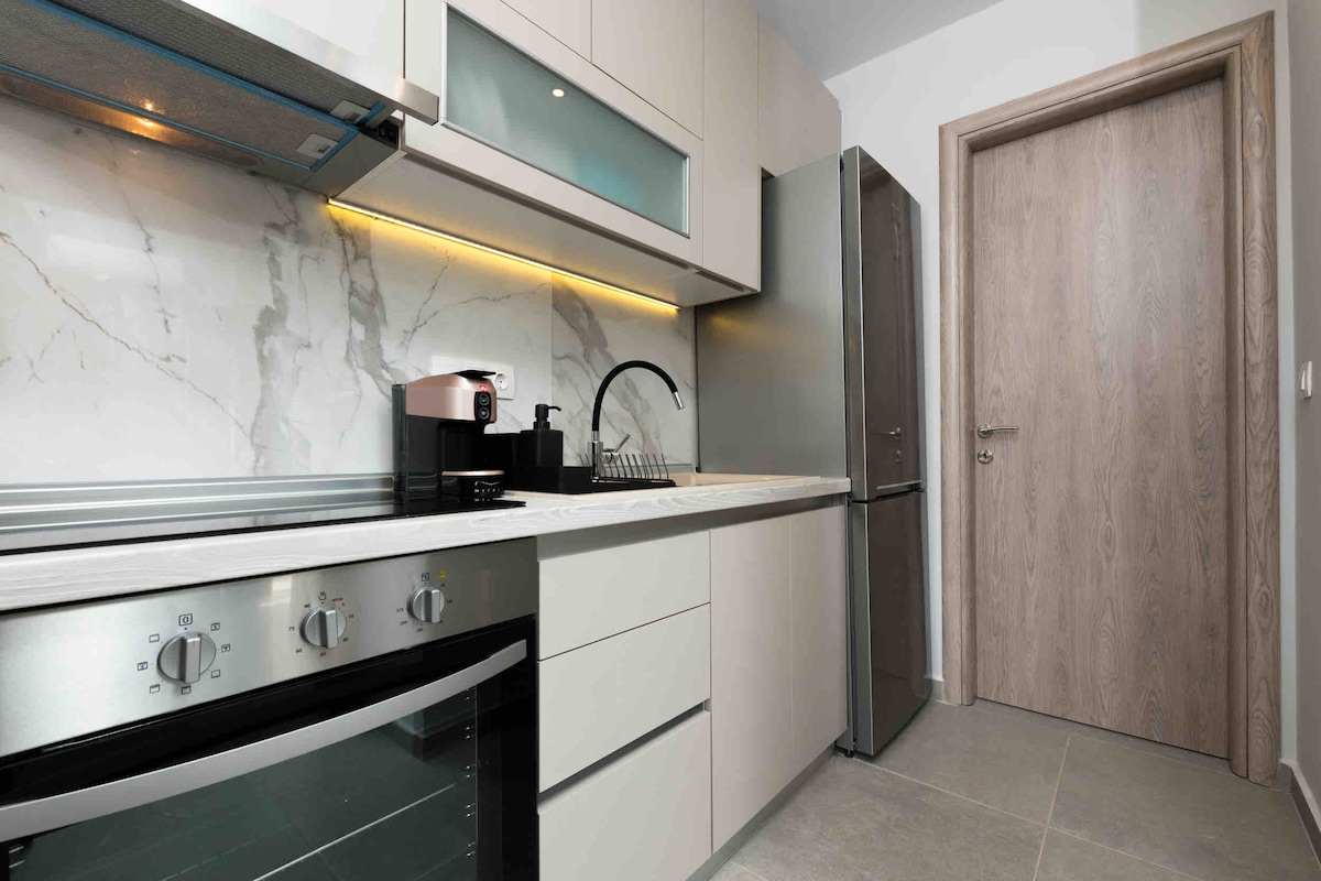 Elite es un moderno apartamento premium (con estacionamiento privado) ubicado en la calle principal de una zona segura cerca del mar (playa de Kalamitsa) y a 4 minutos en auto del centro de Kavala. Puede alojar hasta 4 personas y está debidamente equipado incluso para estancias de varios días, durante todo el año. Se ubica en un piso de un edificio de apartamentos de lujo de nueva construcción y tiene 2 balcones. ¡Está diseñado para que tus vacaciones en Kavala sean inolvidables!