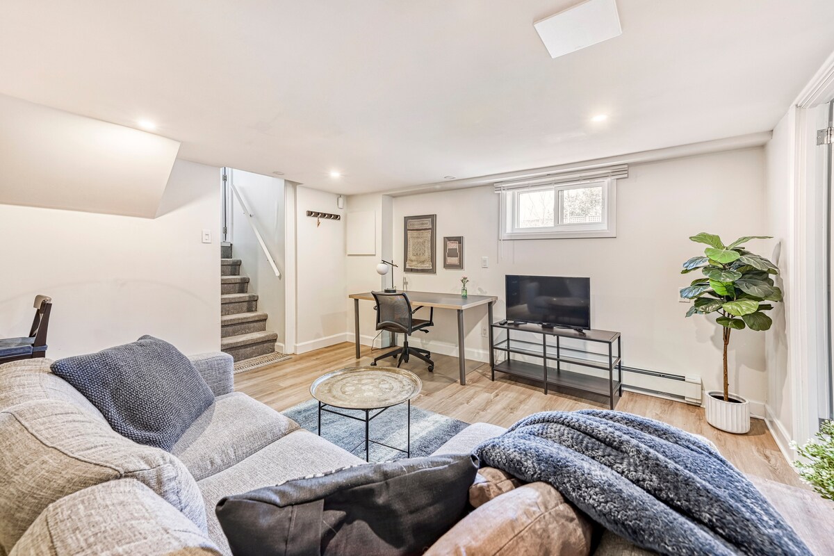 Luminoso apartamento en el sótano con entrada privada en el histórico y deseable barrio de Glebe, en el centro de Ottawa. Este espacio cálido y acogedor es perfecto para una pareja, un estudiante o viajeros de negocios. A poca distancia a pie de lo mejor que Ottawa tiene para ofrecer, incluyendo Lansdowne Park, Parliament Hill, el mercado de Byward y universidades. El canal Rideau está a unas manzanas de distancia. Hay excelentes restaurantes y tiendas cerca. Nuestra tranquila calle tiene vistas a un hermoso parque y el transporte público está a solo una manzana de distancia.