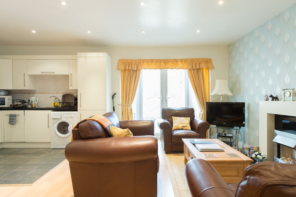 Nuestro apartamento en la primera planta ofrece una habitación con dos camas individuales con baño con ducha, cocina, internet, TV y calefacción por suelo radiante. Aspecto soleado con ventanas a ambos lados. Vistas al jardín y al campo. La casa está situada a unos 100 metros de la carretera y, por lo tanto, es tranquila. Tiene mucho aparcamiento fuera de la carretera y una parada de autobús en el exterior. A menos de 400 yardas tenemos un pub, restaurantes chinos e indios, cafeterías y quioscos. El supermercado más cercano está a una milla de distancia.