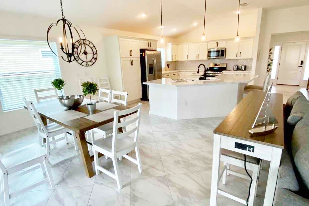 ¡Te damos la bienvenida a tu retiro en Villages! Entra en la comodidad y el estilo en esta casa de diseño bellamente decorada, totalmente amueblada con todo lo que necesitas para una estancia relajante. Desde ropa de cama acogedora hasta muebles modernos. Ubicada en el codiciado pueblo de Osceola Hills, al final de Moyer Blvd, justo al sur de la Ruta 44, esta espaciosa casa de 3 dormitorios y 3 baños (2021 pies cuadrados) cuenta con un garaje para 2 autos y viene con un carrito de golf. Estás a solo unos minutos de Brownwood (3 millas) y Sawgrass Grove (2 millas).