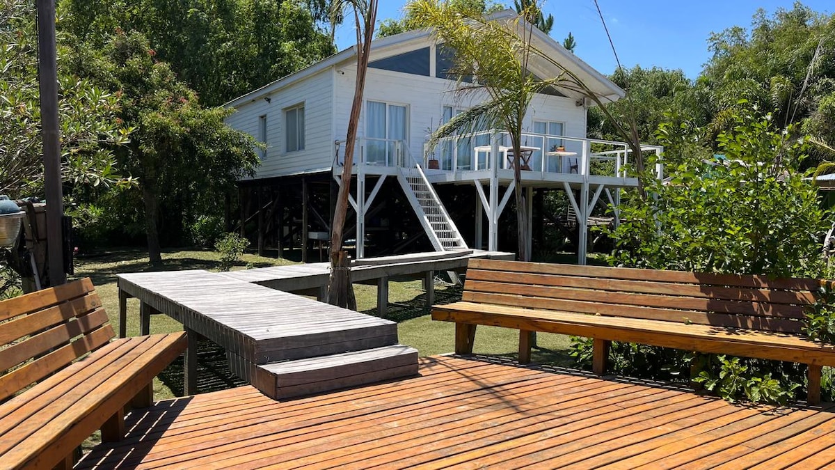 CASA DE ALQUILER de Hasta 4 personas Situada en un amplio parque de 1600m2 con MUELLE PROPIO. A 25 min en lancha taxi o 1hs en lancha colectiva desde la terminal fluvial de Tigre. La casa está equipada para brindarte el confort de un hogar en medio de la isla. Hay Wifi, Smart TV ( Netflix. Youtube) Aire acondicionado frío/calor, ventilador. Cocina completa. Sofá cama 2 plazas No hay toallas ni sabanas Amplio deck techado de 24m2 con living exterior, canoa , reposeras, hamaca y parrilla