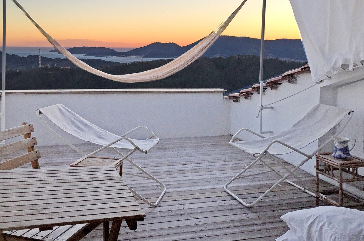 Un oasis de silencio con los pájaros que comienzan a cantar al amanecer. Espléndida vista al mar, rodeada de la vegetación de la naturaleza, jacuzzi y sauna privada para uso exclusivo del apartamento donde puedes pasar momentos románticos e inolvidables. Junto al complejo de playa La Baia Blu, a solo 500 metros de distancia.......... En el hermoso Golfo de los Poetas y a solo 10 km de la estación de tren para el maravilloso 5 Terre Estacionamiento privado, autobús lanzadera gratuito al centro de Lerici y San Terenzo