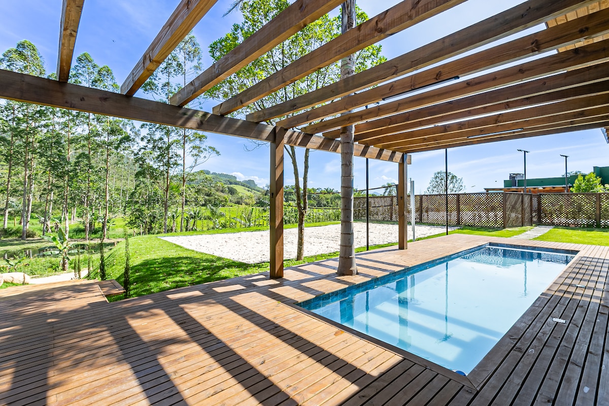 Casa de campo completa para familias y grupos en Canelinha. Conéctate con la naturaleza con total comodidad. ✔ 5 dormitorios (todos con aire acondicionado) ✔ Piscina climatizada y cancha privada. ✔ Bodega con chimenea + sala de juegos ✔ Barbacoa, sala de juegos y parque infantil. ✔ Se admiten mascotas + seguridad las 24 horas ✔ Amplia sala de estar con TV inteligente y wifi 📍 Ubicación estratégica • Situado a 20 minutos de los outlets de SC. • A 25 km del santuario Madre Paulina. • A solo 1,5 km de la autopista. • Cerca de atracciones turísticas y naturaleza.