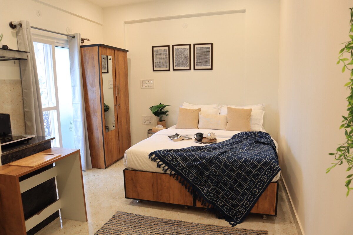 Amplia suite 1BHK de diseño de 600 pies cuadrados con balcón privado | Wifi de fibra óptica de alta velocidad y TV inteligente con plataformas de streaming, escritorio de trabajo/comedor, respaldo de energía las 24 horas, los 7 días de la semana para trabajo y comodidad ininterrumpidos | Cama tamaño king Luxe y colchón ortopédico, armarios de madera para almacenamiento | Cocina pequeña totalmente equipada | Sofá cama en la sala de estar , ocupación máxima 4 | Acceso al ascensor, servicio de limpieza profesional y acceso a lavandería de pago en el sitio para estancias largas | Ubicado en el centro de Bangalore | LGBTQIA++ Afirmativo