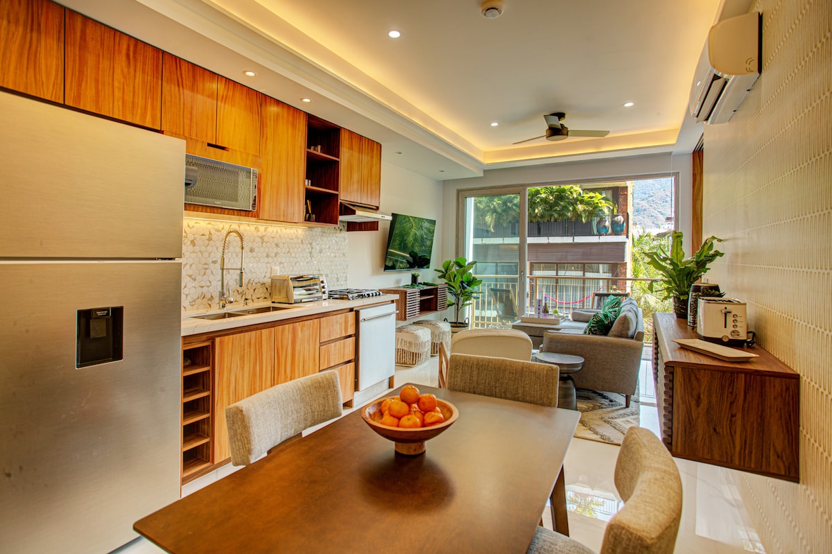 Impresionante unidad de esquina Orchid, 2 dormitorios, 2 baños, ofrece impresionantes vistas de la bahía de Bandares. Nuevo apartamento de lujo estilo resort que ofrece 2 piscinas grandes, gimnasio, restaurante y bar en la azotea, limpieza de la casa y seguridad las 24 horas. Ventanas plegables que abren el espacio por completo. Ubicado en Conchas Chinas. Acceso directo a la playa, a poca distancia a pie del centro de Puerto Vallarta y de la playa de Los Muertos. Conserje personalizado, recogida en el aeropuerto, compras de comestibles, actividades, masaje en el apartamento, chef privado y mucho más...