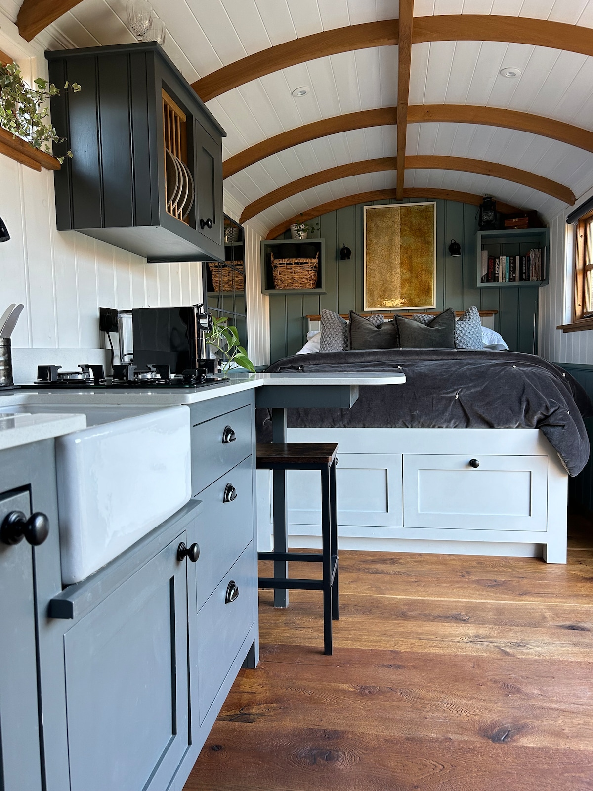 Este refugio rural es la escapada romántica perfecta, a solo 35 minutos en taxi/tren de Londres. Relájate en tu jacuzzi privado de lujo, disfruta de una botella de champán bajo las estrellas y despierta con vistas impresionantes de campos ondulantes y vida silvestre. Nuestra cabaña de pastor artesanal combina el encanto rústico con la comodidad moderna, que ofrece una cama tamaño king para observar las estrellas, una acogedora terraza iluminada por el fuego y un baño de lujo, todo ubicado en un prado tranquilo.