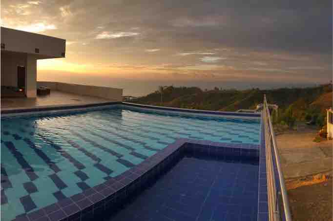 Casa de madera, elegante y cómoda con jacuzzi vista al mar. Localizada en la parte rural de Atacames al frente de un mirador. Un lugar tranquilo en la naturaleza a 15 minutos de caminata de la playa de Atacames por un sendero lleno de flores y con mirador 180 grados al océano. Casa de dos pisos, con la cama matrimonial en el segundo piso con vista al mar. Tienen internet Starlink alta velocidad, una área de descanso, con hamacas, bbq y jardín, un comedor exterior y un jacuzzi de 6 personas.