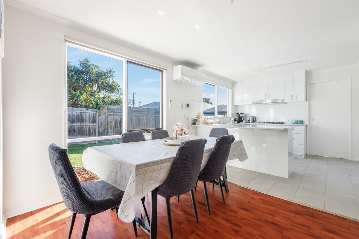 Relájate en esta casa de playa llena de luz, a solo 2 km de la playa y Peninsula Hot Springs, perfecta para una escapada relajante. Disfruta de tu café por la mañana o vino por la tarde en la amplia terraza, completa con chimenea y vistas a la copa de los árboles. Tiene capacidad para 6 personas en 3 dormitorios tamaño queen, cada uno con amplio espacio en el armario y un espejo de cuerpo entero. Disfruta de wifi gratuito, TV inteligente de 65 pulgadas y juegos de mesa. Cocina con facilidad en la cocina totalmente equipada. Además, disfruta de aire acondicionado/calefacción, baño, lavandería y amplio estacionamiento.