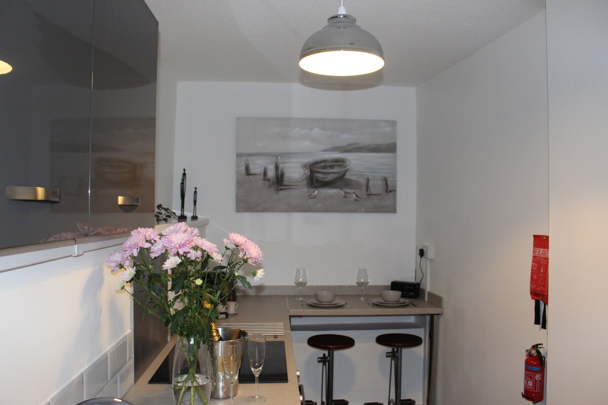 Impresionante apartamento de 1 dormitorio justo al lado del paseo marítimo de Torquay, a 5 minutos a pie de la playa y a 15 minutos del puerto deportivo y del centro de la ciudad. Cerca de la estación de tren y paradas de autobús. Cocina/comedor/salón, está bien equipado y decorado a un nivel muy alto. Espacio exterior privado amurallado, con estanque elevado y cascada. Plaza de estacionamiento exclusiva con cargador de vehículos eléctricos (cargo máximo de £ 0,465/KWH). 3 noches de estancia mínima 3-5 noches de temporada alta mínima. Esta es una zona residencial tranquila y, por lo tanto, adecuada solo para aquellos que tienen en mente una estancia tranquila.