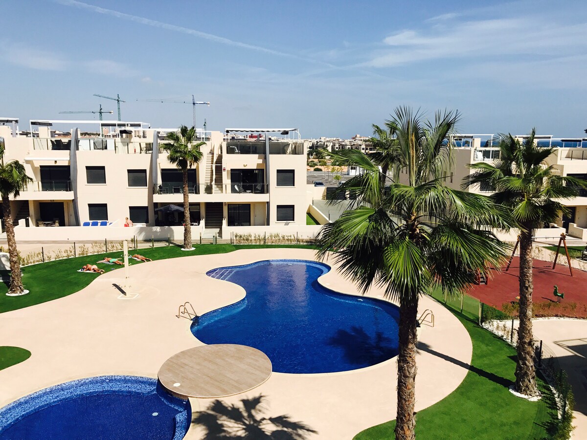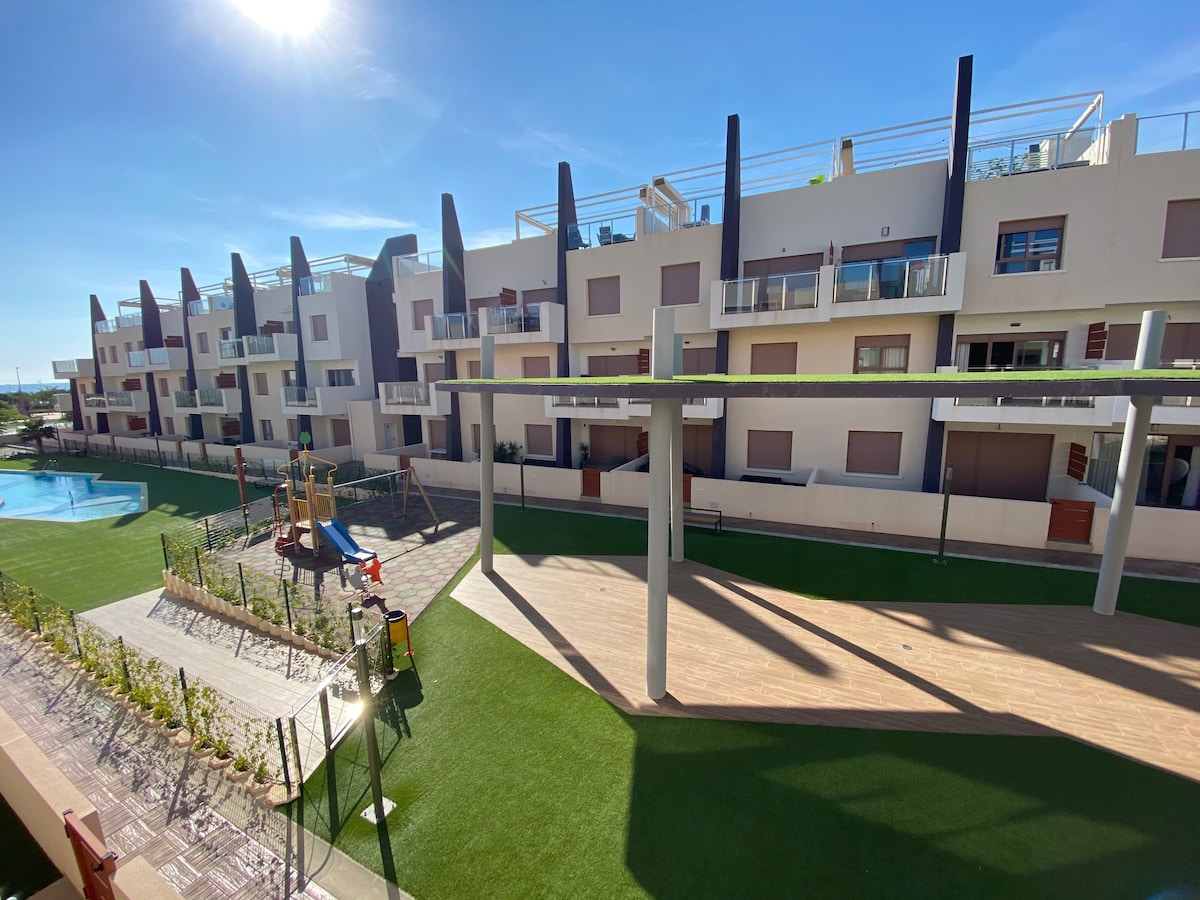 Buscas unas vacaciones en una localización moderna, a pocos metros de la playa? 'Bianca Beach' es perfecto para disfrutar en pareja, con familia o amigos. Construido en 2020, este residencial privado y completamente cerrado con muro perimetral tiene 2 piscinas. Está a 2 minutos andando de la playa Mil Palmeras, con 10 meses de sol al año. Este apartamento en planta baja está completamente equipado, con mucha luz. Lo más atractivo son sus terrazas, una con orientación sur y otra norte.