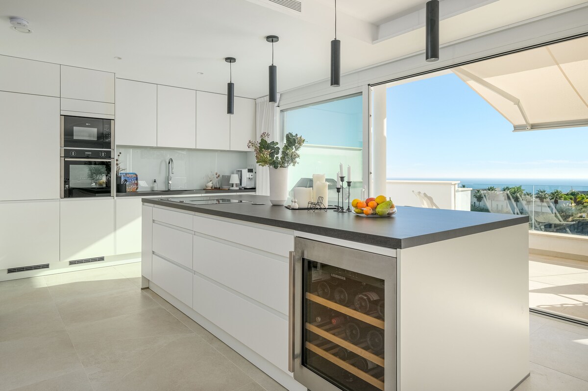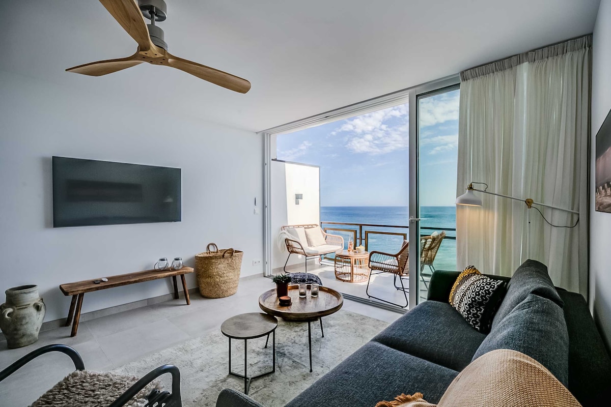 Apartamento con vistas panorámicas al mar, playas y piscinas.