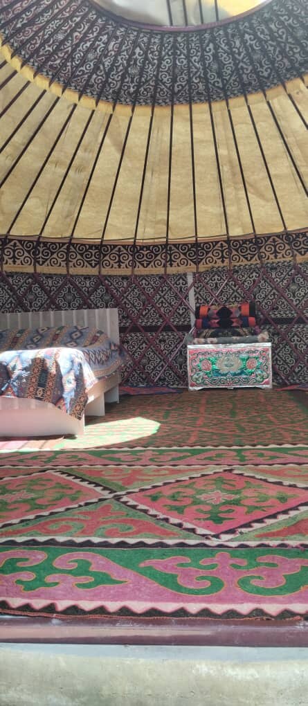 Yurta tradicional kirguisa, situada en la montaña Gealogia en Barskoon. Hay muchos senderos para caminar y excursiones a los que se accede desde dentro de la propiedad. La yurta es espaciosa, con una cama tamaño queen y dos individuales con su propio inodoro. La propiedad está rodeada de vistas a la montaña y también está a poca distancia a pie de todos los servicios principales de la ciudad. La cocina tradicional kirguisa es parte de la experiencia y está disponible para desayunar, almorzar y cenar. Hay taxis disponibles regularmente para acceder a los lugares de interés turístico.