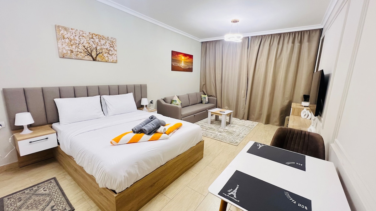 ¡Bienvenido a tu elegante estudio en Hurghada, a solo unos pasos del Mar Rojo! El luminoso estudio ofrece una comodidad moderna con una sala de estar abierta, una acogedora sala de estar y una zona de cocina totalmente equipada. Disfruta del balcón privado y el área de la piscina rodeada de palmeras y flores. Con servicios como wifi gratuito, aire acondicionado y acceso a piscinas, este estudio ofrece el refugio ideal para tu estancia junto al mar.