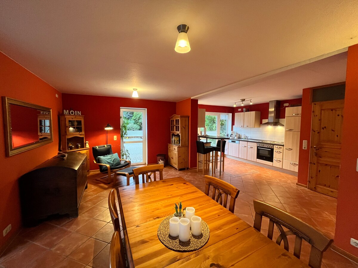 Nuevo (2021), apartamento de vacaciones idílico en el interior del mar Báltico con mucho espacio para familias. Ofrecemos conexión de fibra óptica con wifi fiable para teletrabajar. A 10 minutos en coche de la playa del mar Báltico de Schönberger Strand o a 15 minutos en bicicleta por caminos rurales de la playa natural más cercana. Las familias son bienvenidas. Los alrededores invitan a dar largos paseos, montar en bicicleta, explorar, relajarse y jugar en la naturaleza.