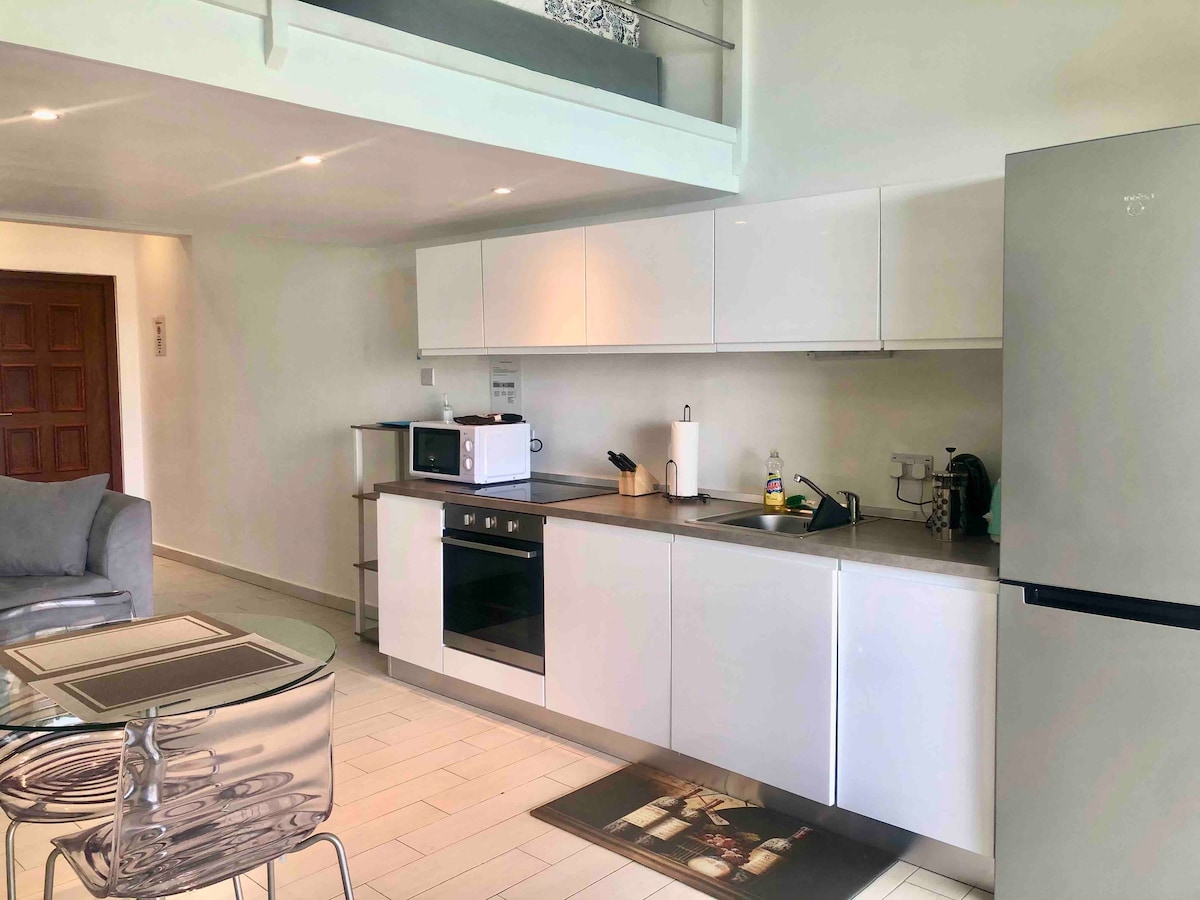 Este moderno apartamento tipo estudio totalmente amueblado y de reciente construcción es perfecto para parejas, personas que viajan solas o viajeros de negocios. La cocina está totalmente equipada con utensilios básicos de cocina y comedor, cafetera, licuadora, tostadora, microondas y hervidor de agua, además de nevera, estufa y horno. El dormitorio cuenta con una cama tamaño queen, sofá, estación de trabajo y TV. Convenientemente ubicado muy cerca de centros comerciales, restaurantes, entretenimiento, playas y el Aeropuerto Internacional Maurice Bishop.