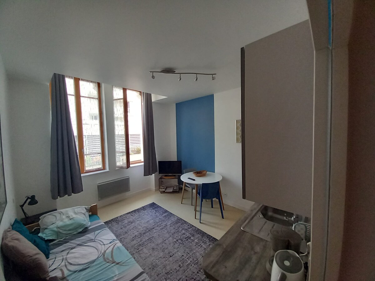 acogedor estudio 1er piso centro de la ciudad cerca de restaurantes, tiendas, mercado y transporte público estacionamiento en las inmediaciones con cocina equipada 2 camas de 90 posibilidad de instalarlas una al lado de la otra/entrada independiente/ baño con ducha inodoro estudio tranquilo y luminoso en un pequeño edificio