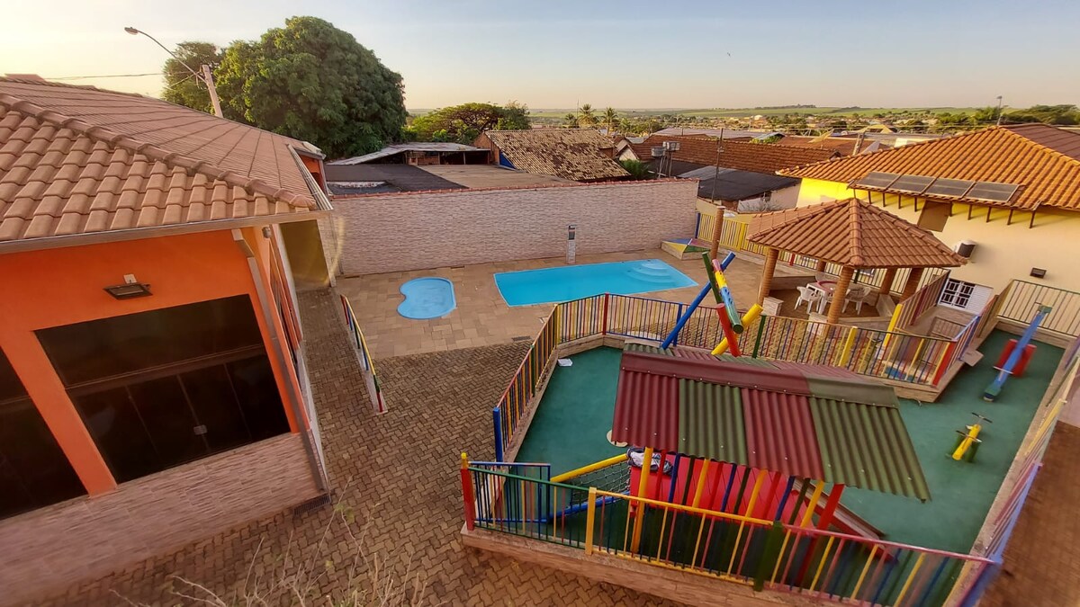 Se encuentra en la tranquila ciudad rural Olímpia-SP, en el noroeste de São Paulo. Donde las temperaturas son altas durante todo el año. Está a 4 km del parque acuático Thermas dos Laranjais. Son suites compuestas por triliche y cama de boxeo doble, TV de 32 pulgadas, wifi, aire acondicionado dividido, ventilador de techo, minibar, sábanas de cama y baño de calidad y estricto estándar de higiene. Ofrecemos desayuno de acuerdo con el tiempo estipulado.