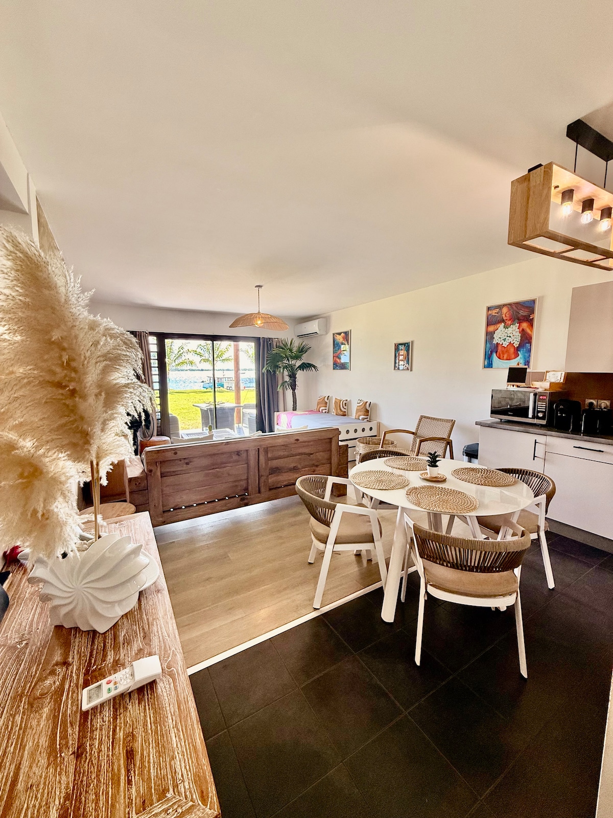 Bienvenido al apartamento VIEW en el impresionante paraíso de Bora Bora. Al entrar en el apartamento, quedarás cautivado inmediatamente por la impresionante vista que te espera. Los ventanales del suelo al techo abarcan todo el espacio habitable, lo que permite que una abundante luz natural inunde la habitación mientras muestra el impresionante panorama exterior.