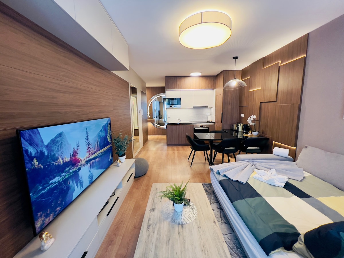 Bienvenido a nuestro acogedor apartamento en un complejo residencial diseñado al estilo italiano. Este alojamiento es perfecto para aquellos que valoran la paz y la comodidad. La característica principal es un amplio balcón con jacuzzi, ducha al aire libre, tumbonas y zona de comedor. El complejo está rodeado de tiendas, incluidas las que están abiertas las 24 horas, y cafeterías. La práctica ubicación ofrece fácil acceso al transporte público, lo que te permite llegar rápidamente a cualquier punto de la ciudad. Nuestro apartamento es tu acogedor refugio en la ciudad.