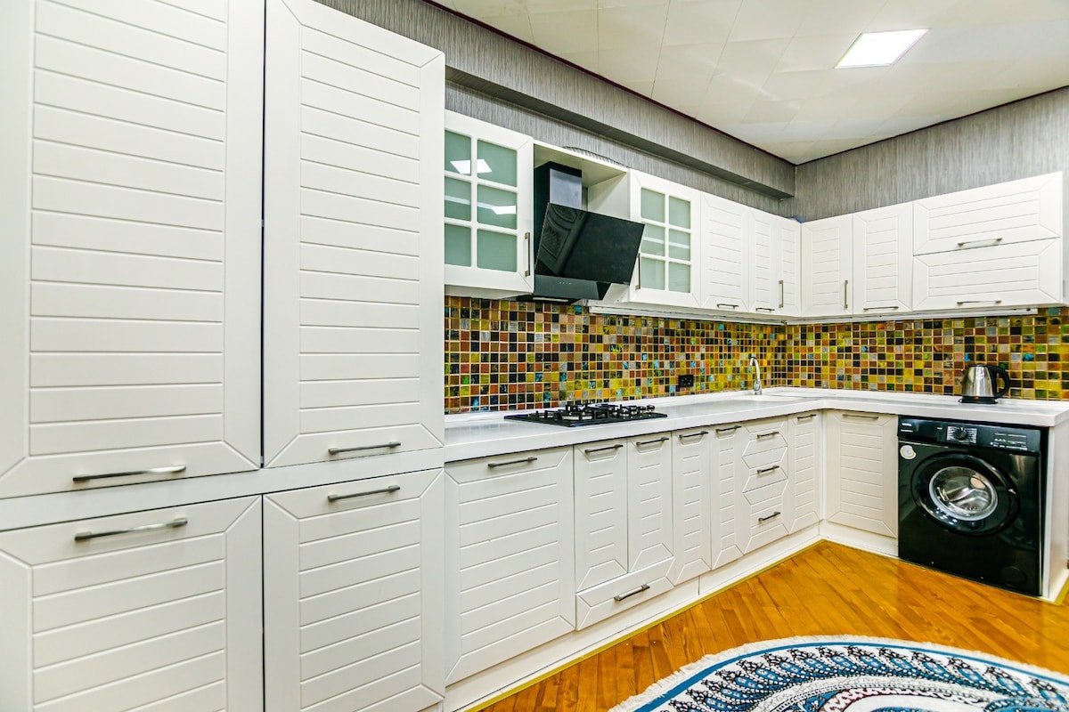 Ubicación privilegiada: alójate en White City, uno de los barrios más modernos y vibrantes de Bakú, lleno de restaurantes, cafeterías y tiendas. Seaside Boulevard está a solo 1 km. Sueño cómodo: cama tamaño king de 180 cm de ancho con colchón ortopédico. Entretenimiento: TV inteligente de 65" con aplicaciones de streaming + Wi-Fi de alta velocidad de 100 Mb/s Cocina bien equipada: lavavajillas, microondas, cafetera, nevera y todos los utensilios de cocina básicos. Comodidades pensadas: todo lo que necesitas para una estadía cómoda y sin estrés