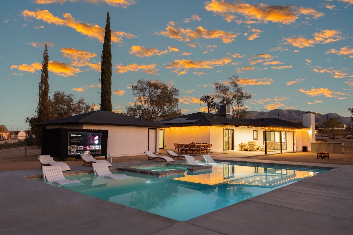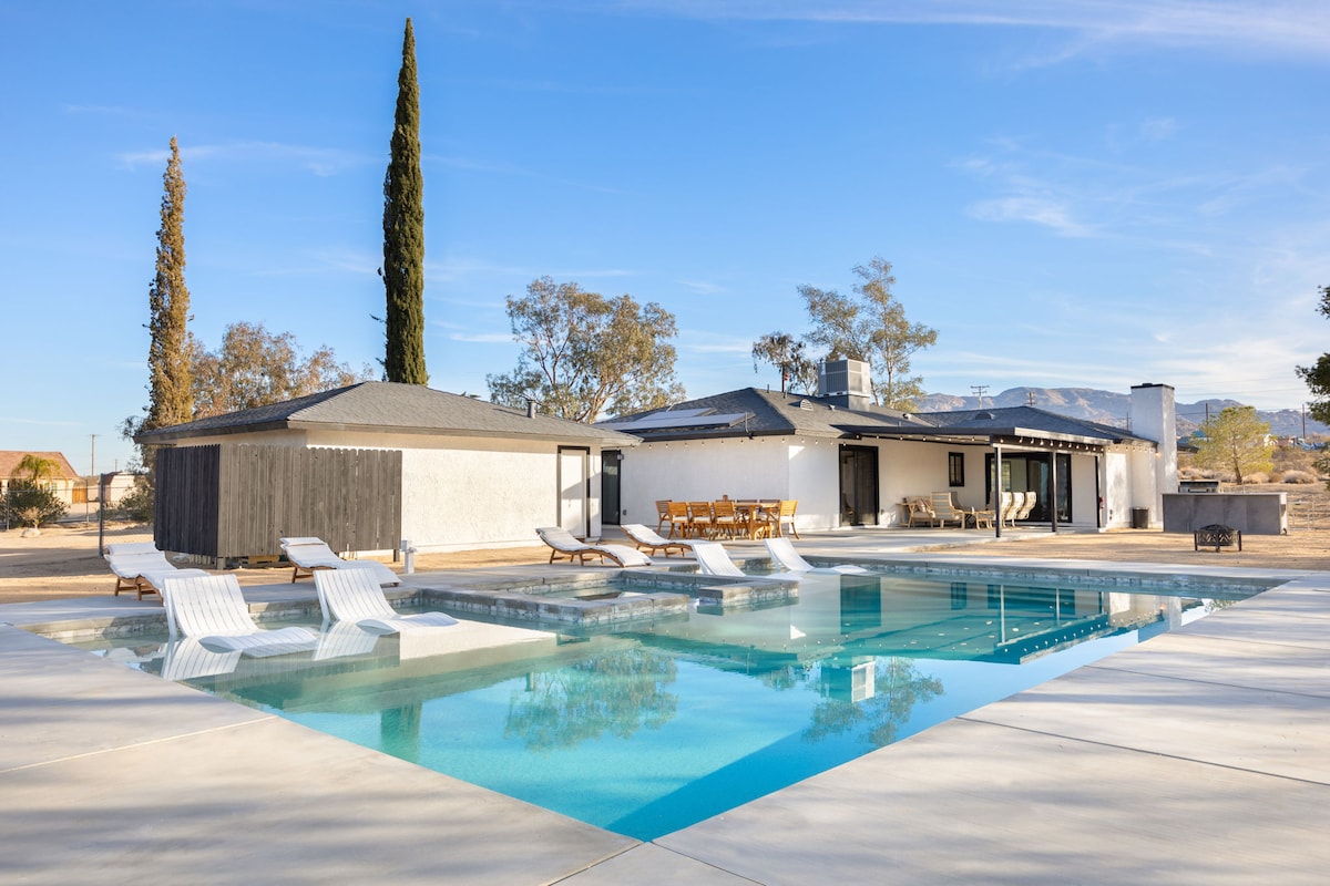Sumérgete en esta lujosa casa de 3 dormitorios y 2 baños recién construida, con amplias ventanas que revelan los impresionantes paisajes, una piscina climatizada y un spa para disfrutar de baños bajo las estrellas, y un espacio dedicado al fitness. Relájate bajo cielos infinitos en 2 acres en tu propio oasis privado, perfecto para observar las estrellas y reunirse en el patio. Despiértate con impresionantes amaneceres, explora las maravillas de otro mundo de Joshua Tree y vuelve para darte un baño rejuvenecedor en tu refugio en el desierto.