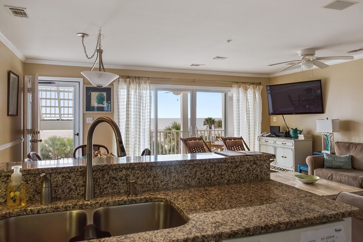 Nos encantó este condominio a primera vista. La vista es increíble, y recientemente se ha actualizado y renovado. Baja las escaleras del condominio y sigue un paseo de arena de 5 minutos hasta el océano. El condominio tiene una vista despejada a la playa y al mar. Este condominio ofrece acceso privado a la playa, dos grandes piscinas y estacionamiento cubierto gratuito. ¡No se puede acercar mucho a la playa! Pregunta por nuestro alquiler de carritos de golf. Este condominio está en el tercer piso y no hay ascensor. ¡Hay 46 escalones, sin embargo, la vista es increíble!