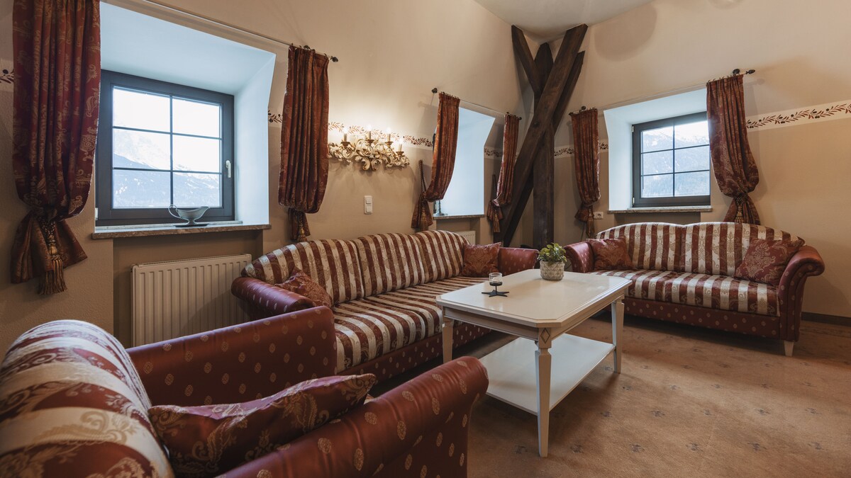 ¡¡¡Nuevo!!! ¡¡¡Desde el 23 de mayo de 2025!!! Hemos construido una suite de diseño exclusivo para ti con vistas panorámicas del Zugspitze para 2-3 personas en 48 m². Aquí, el encanto alpino se encuentra con las comodidades modernas. El diseño interior abierto y luminoso hace de la suite el lugar perfecto para disfrutar. Un punto destacado es la bañera independiente, donde puedes disfrutar de las impresionantes vistas del macizo de Zugspitz. El departamento se ubica en el antiguo Jagdschlössl, Ansitz Felsenheim.