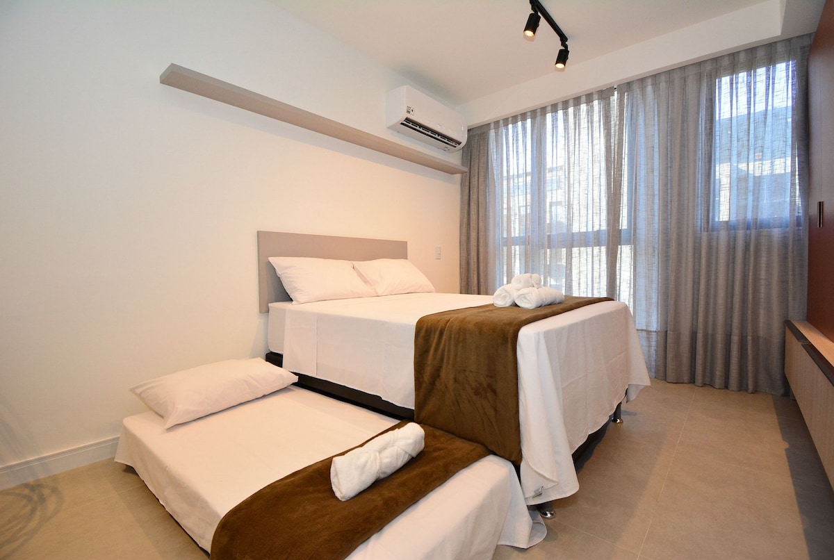 Apartamento en barrio súper bien ubicado, con fácil acceso a las playas del sur y del norte. Cerca del centro comercial, supermercados, farmacias, bares, parada de autobús, restaurantes, gasolinera y frente a la Universidad Federal. Tiene aire acondicionado, todos los utensilios de cocina, TV, entre otros. El apartamento tiene una cama queen y un sofá cama doble. Tiene garaje cubierto privado dentro del condominio. El espacio cuenta con calefacción por aire retro para dar más calidez a los días fríos.
