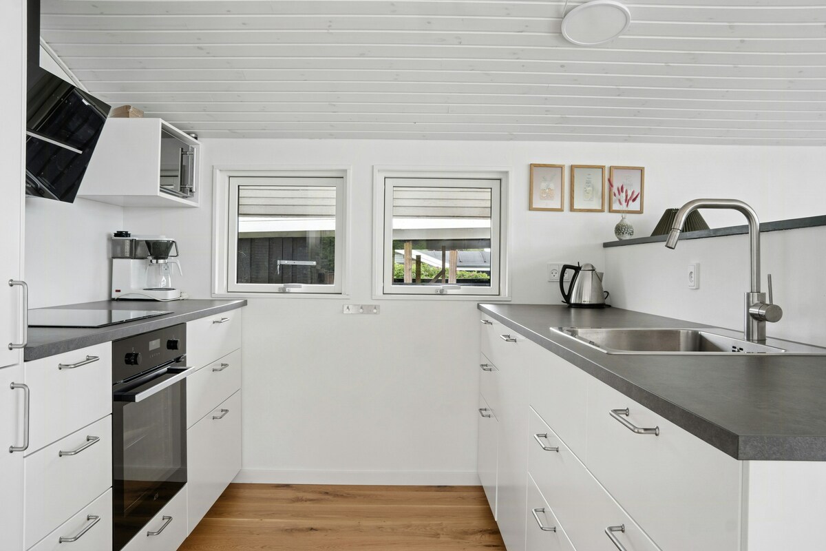 Nueva casa de campo de lujo de 115 m2, con 80 m a playa apta para niños. 3 dormitorios grandes. y 2 bonitos baños. Salón grande de 50 m2 que contiene cocina con lavabo/lavavajillas, mesa de comedor con espacio para 10 personas, acogedora zona de estar, estufa de leña y gran loft con vistas al mar. La sección de invitados tiene su propia entrada y baño. En el exterior hay una gran terraza con refugio y sol/luz desde la mañana hasta la noche. La casa está en una zona de campo densa y acogedora. Perfecto para 3 generaciones o dos amigos con niños