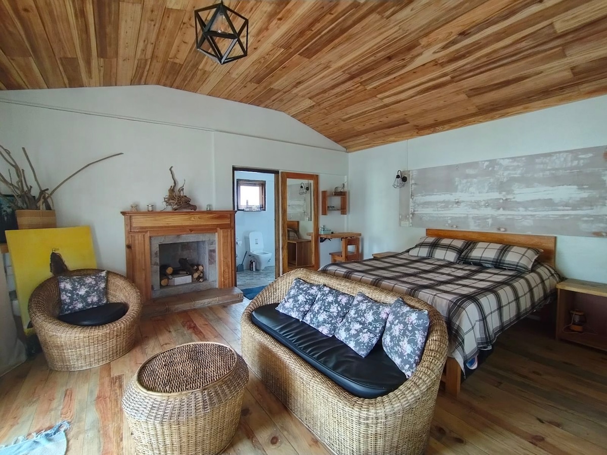 Este elegante alojamiento es perfecto para una pareja y una familia de 3. La cabaña se encuentra en una propiedad de un acre con vistas a un pinar y árboles frutales ( ciruela, melocotón y pera ) al sur, un prado y colinas en el telón de fondo hacia el este. Es una habitación acogedora y espaciosa con una chimenea interior, cocina y comedor con todos los electrodomésticos. Los pisos de madera en el dormitorio, la cocina y la terraza se suman al ambiente del entorno rústico. El agua se obtiene de un manantial dentro de las instalaciones.