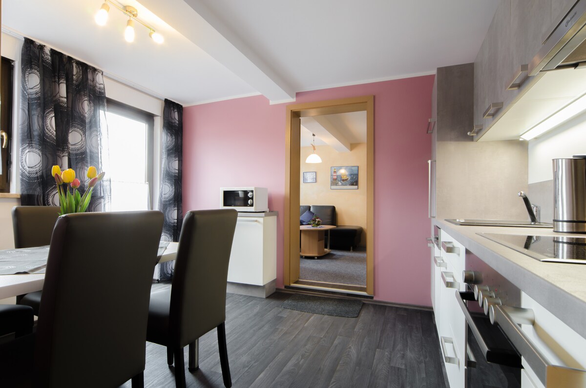 Nuestro apartamento de vacaciones Lohberg en la planta baja con terraza grande: - Tamaño: 75 m² para 2 personas - Planta baja con terraza grande y acceso directo al jardín - Wifi gratuito - Suelo laminado - Acogedora cocina-comedor con cocina bien equipada - Sala de estar con un gran sofá, cama supletoria posible - Dormitorios con colchones de muelles - Baño con lavabo doble, bañera, inodoro y ducha - TV moderna vía satélite - Incluye ropa de cama, toallas de ducha/manos y paños de cocina